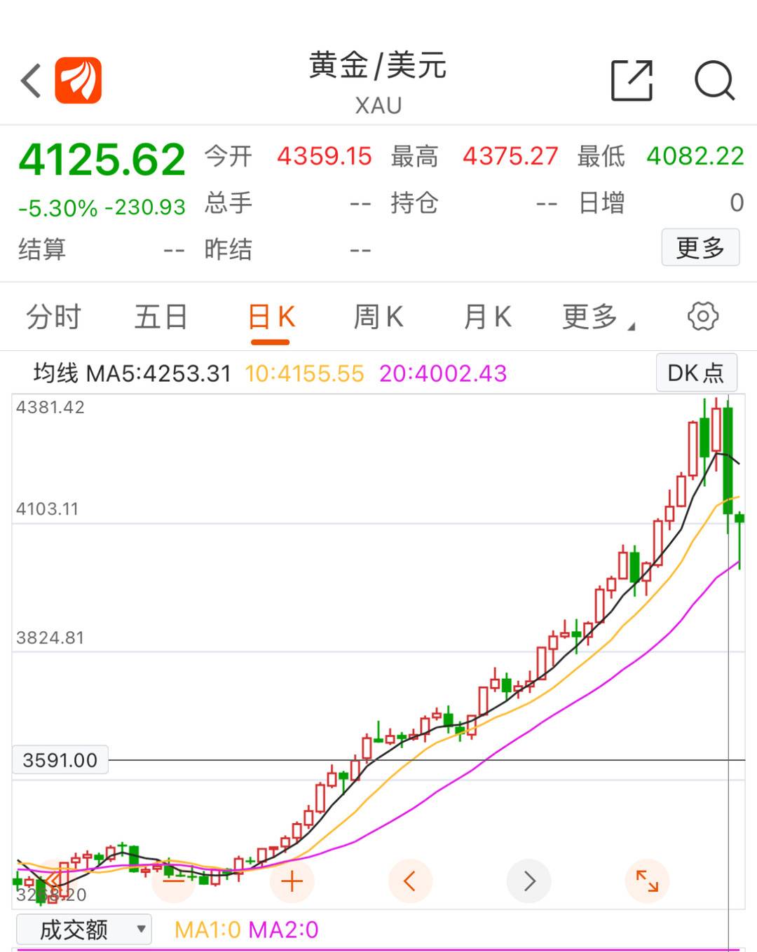 10月21日晚,国际金银大幅收跌,现货黄金大跌5.31%,报4124.36美元/盎司,盘中一度跌超6%,最低报4080.87美元/盎司,创自2013年4月以来的最大单日跌幅;COMEX黄金期货收跌5.07%,报4138.5美元/盎司。